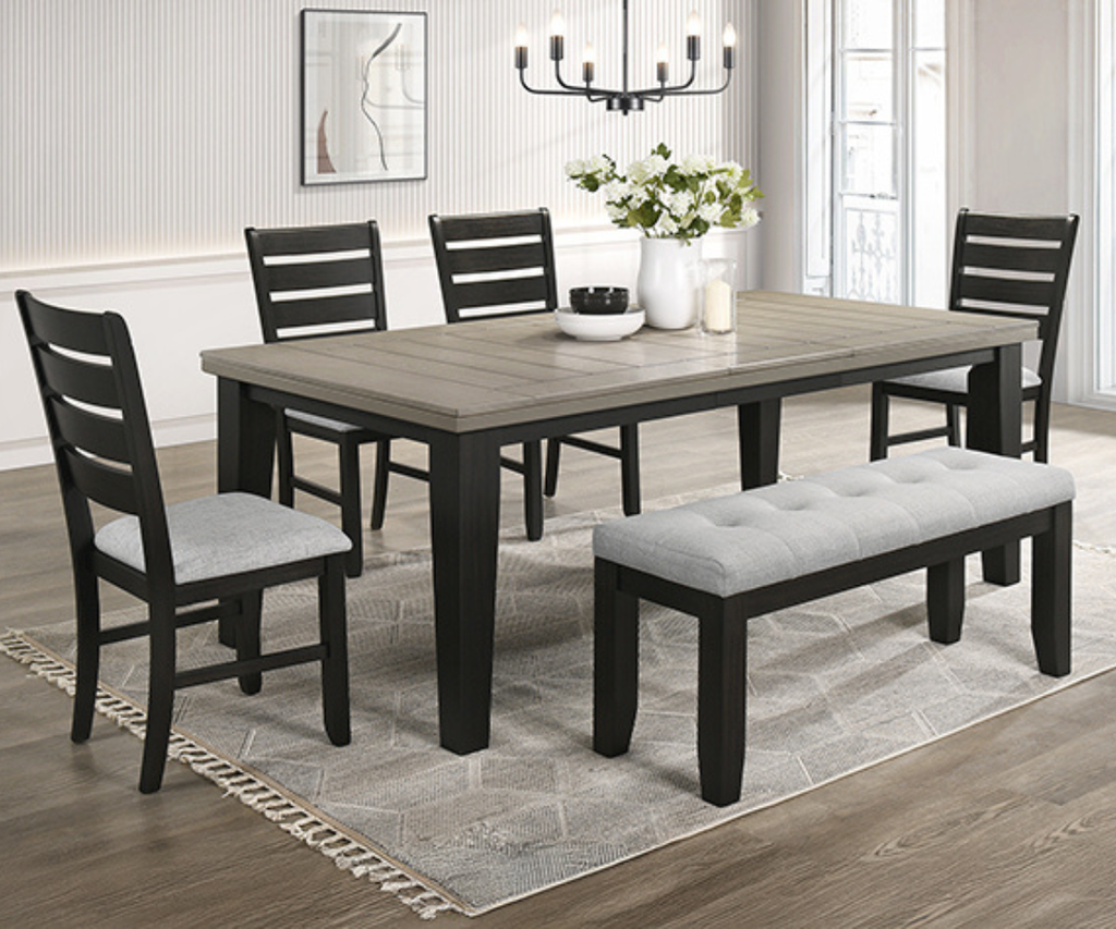 This dining group effortlessly combines farmhouse warmth with modern sophistication, creating a captivating focal point for any dining space. The table features a rich, two-tone design with a beautifully finished wood top and contrasting dark legs, delivering a striking visual appeal that suits various decor styles. The ladder-back chairs and tufted bench offer both style and comfort, with plush upholstery in a versatile neutral tone that invites guests to linger. With its blend of rustic charm and contemporary flair, this set is perfect for both intimate family meals and lively gatherings, making your dining area a stylish and welcoming retreat.