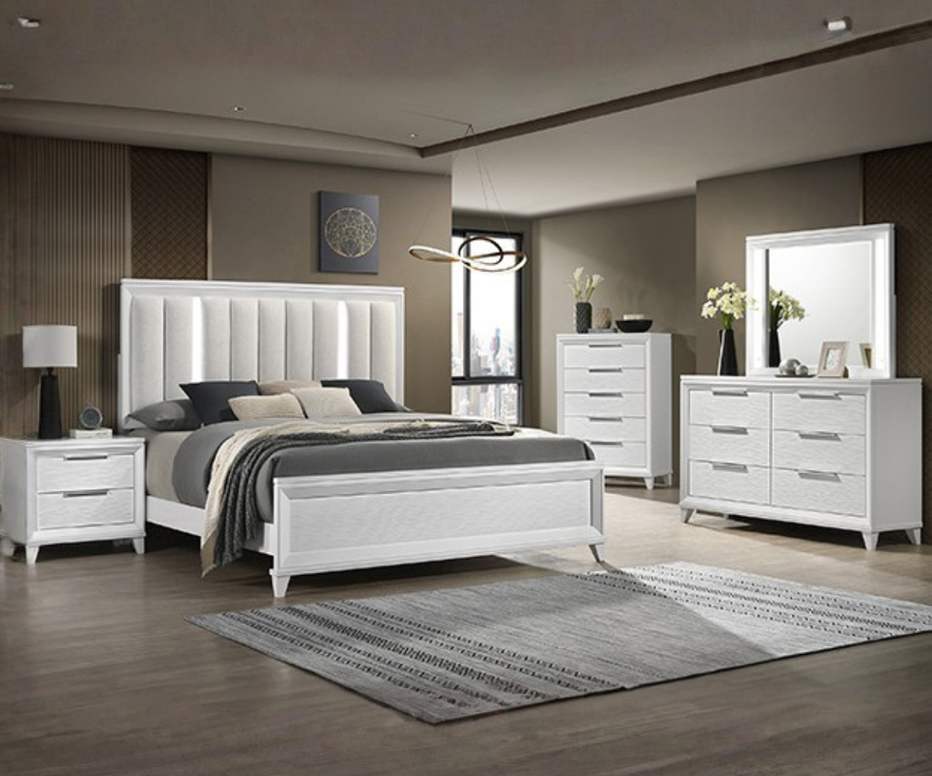This bedroom set is the epitome of modern elegance, designed for those who desire a sleek and sophisticated sleeping environment. The crisp white finish of the furniture brings a refreshing vibrancy to the room, making it feel both spacious and inviting. The centerpiece, a plush upholstered bed, features an impressively tall headboard with deep channel tufting and integrated lighting, creating an aura of luxury and comfort. Accompanying the bed are streamlined nightstands and a dresser, each boasting a minimalist design with distinctive textured front panels and discreet handles that enhance the set's contemporary charm. The matching backlit dresser mirror expands the visual space and completes the look, making this collection a perfect blend of function, style, and comfort for the modern home.